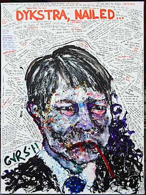 Portrait of former Met, legendary stock picker and Jim Cramer protege, Leonard "Nails" Dykstra, now facing 180 years in the clanger for bankruptcy fraud. Annotated exclusively through Dealbreaker.com, although I added the Mets 86 opening day roster in blue and Nails' career stats in orange. This piece is smaller than the usual annotated paintings, measuring an office-friendly 3' x 4'.